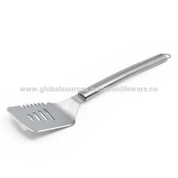 22 Best Grill Spatulas Reviews of 2022 List You Can Buy Update International has a heavy-duty spatula for grill masters! This extra-large, commercial-grade turner spatula flips small and large portions of food with ease. The quality stainless steel turner spatula blade is securely riveted to a taper-formed smooth wood handle. It features a large spatula face with one-side cutting edges, which can be used for cutting food and meats while grilling.